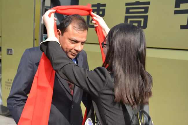 ▲前往工廠參加慶典 早上10:00分,大家乘坐由維多利公司統(tǒng)一安排的大巴到達(dá)活動(dòng)現(xiàn)場(chǎng),一下車入目全是各種寫著“維多利科技(江蘇)有限公司開業(yè)大吉”的橫幅和彩帶,一進(jìn)門熱情的維多利迎賓姑娘們立即為遠(yuǎn)道而來(lái)的客人獻(xiàn)上溫暖的紅色圍巾。