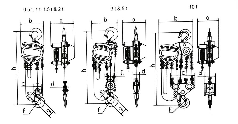 | 型號(hào) | 額定載荷(t) | 起升高度(m) | 實(shí)驗(yàn)載荷(N) | 手拉力 (N) | 起重鏈條 | 主要尺寸(mm) | 凈重(kg) | ||||